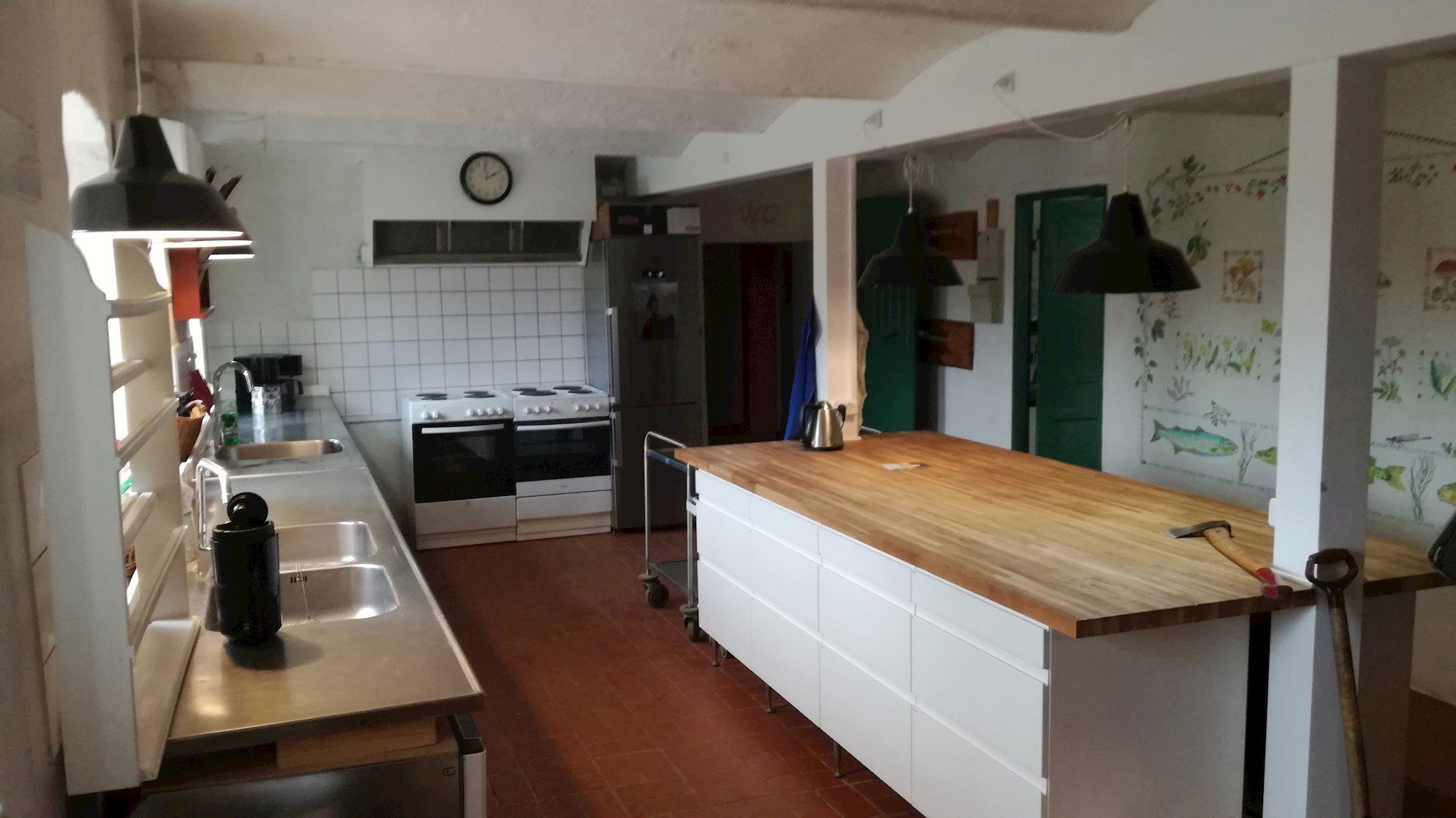 I Naturskolestuen er der borde og stole til 60-70 personer. Der er adgang til køkken med 2 elkomfurer/ovne, køle- og fryseskab, opvaskemaskine, 2 kaffemaskiner, elkedel, termokander, gryder, potter og pander, knive samt service.