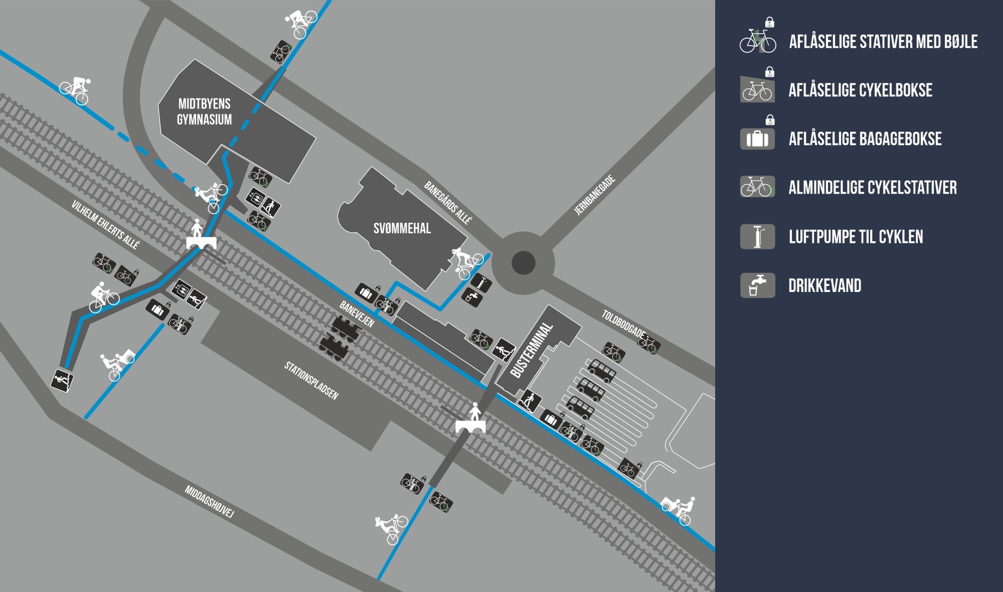 Syd for banen er det ved Hærvejsbroen og perronbroen. Nord for banen er det ved busterminalen og i skuret ved parkeringspladsen overfor svømmehallen.